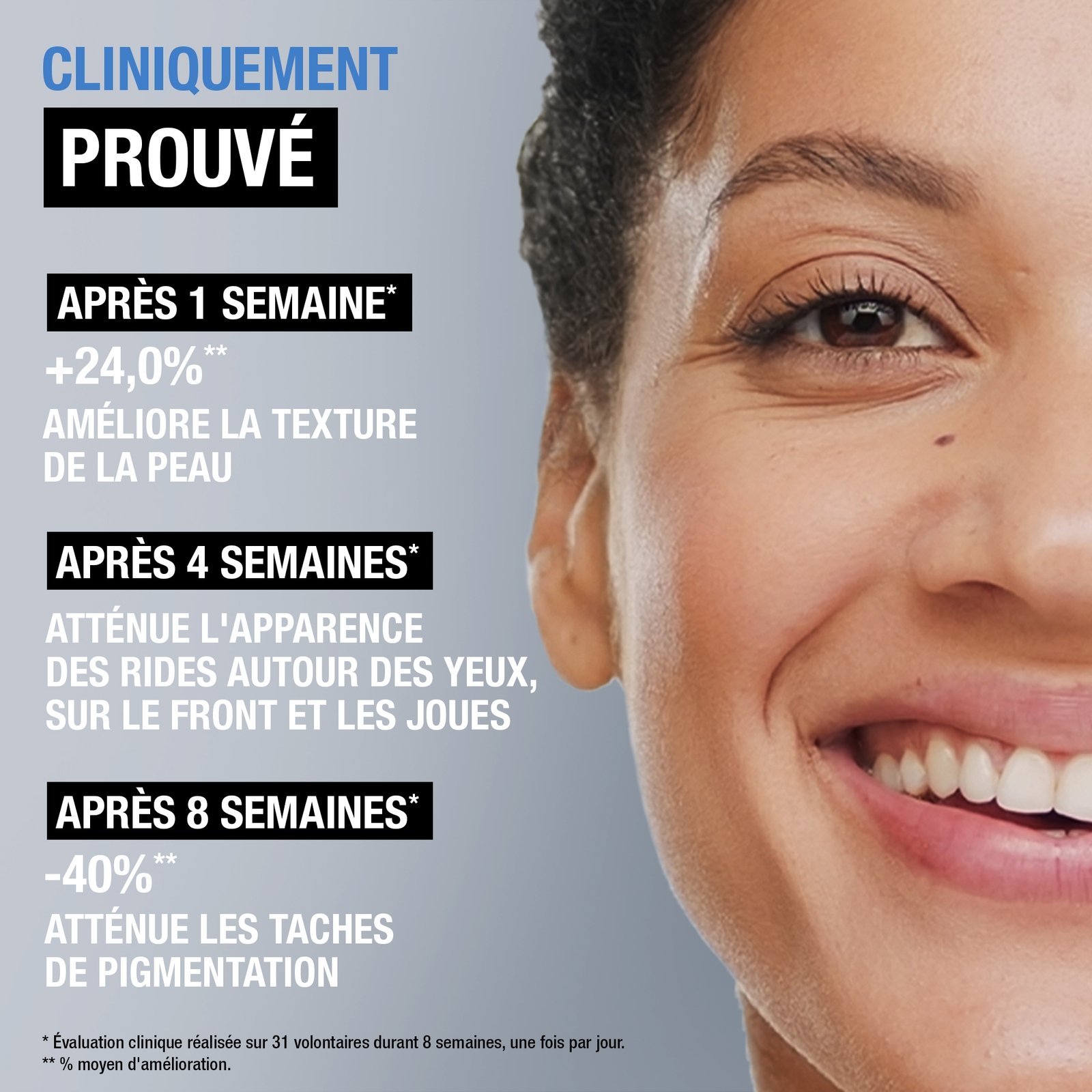 Si efficace que 100 % des testeurs ont constaté un résultat visible après 1 semaine*. *Évaluation clinique réalisée sur 31 volontaires durant 8 semaines, une fois par jour