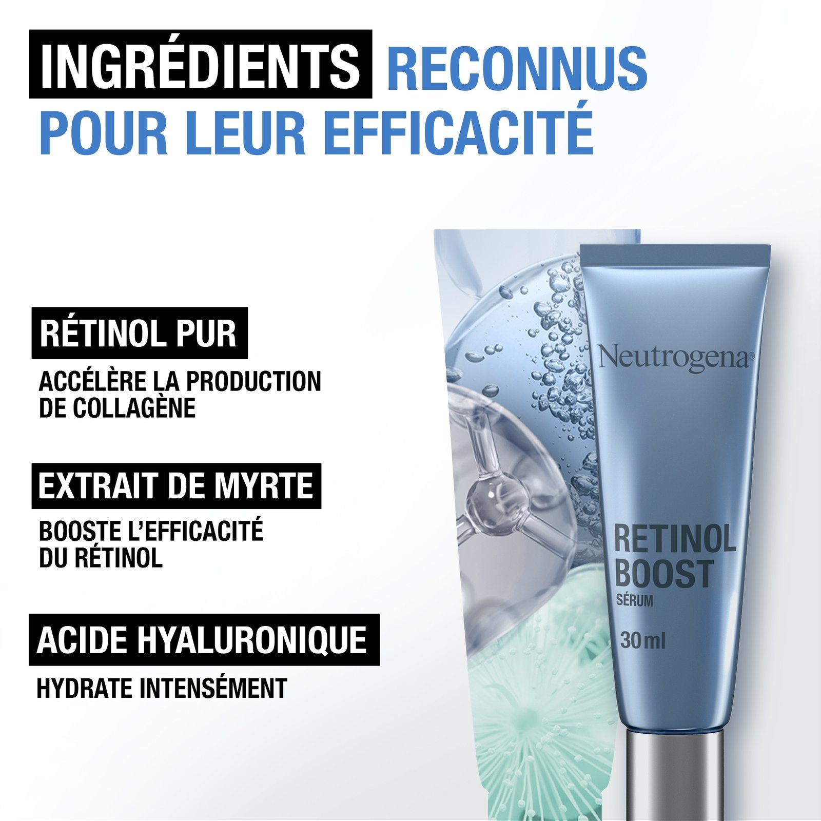 • Le rétinol pur, une forme de vitamine A reconnue par les dermatologues, est prouvé scientifiquement comme accélérateur de la production de collagène et stimulant du renouvellement cellulaire à la surface de la peau. • De l’extrait végétal de myrte pour booster l’efficacité du rétinol.